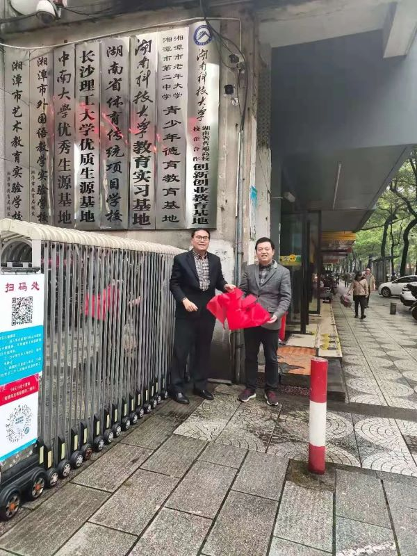 在二中门口,聂志军教授与唐新球校长代表双方喜揭红绸,共同完成揭牌仪式,湘潭市二中正式成为“米兰平台大学生创新创业基地”。这是一次我院与二中融通融合,创新发展的良好契机,将开启双方友好往来、通力合作的新篇章。