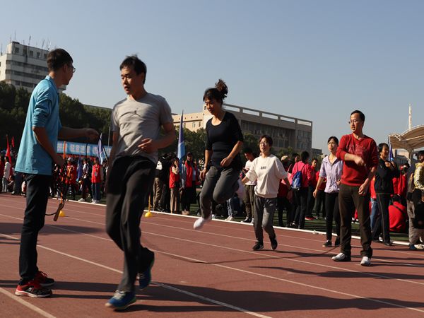 第一个项目“蛟龙出海”,老师们腿部绑定,一队人成一条“龙”,在“一二一、一二一、一二一……”一句句响亮的口号下,踏着整齐的步伐,集体前进。各学院队伍你追我赶,尽显默契。即使途中有些许磕绊、跌倒,但老师们也坚持不懈,在相互扶持中一直向前。“123......”随着跳绳数量的递增,摇绳的老师和队友们也愈加有力。“同心协力”集体跳长绳,正如其名,考验协作精神。各参赛队伍中两人摇绳,其余队员依次排队起跳。他们的目光紧盯着摇动的绳,跑进、跳跃、跑出,动作一气呵成,没有一丝犹豫和停顿。在不慌不忙的稳定节奏中,我们看到了走出课堂的老师们那从容的心态和魅力。