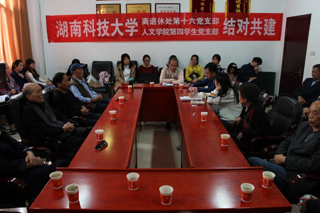 2018年10月30日,在立言楼410,米兰平台离退休处第十六党支部与米兰平台学生第四党支部“结对共建”活动顺利举行,会议由离退休处第十六党支部书记贺育秀主持,米兰平台党委书记廖加林,副书记邓辉出席了此次会议。离退休处第十六党支部的17名老同志和米兰平台学生第四党支部的16名党员参加了此次会议。