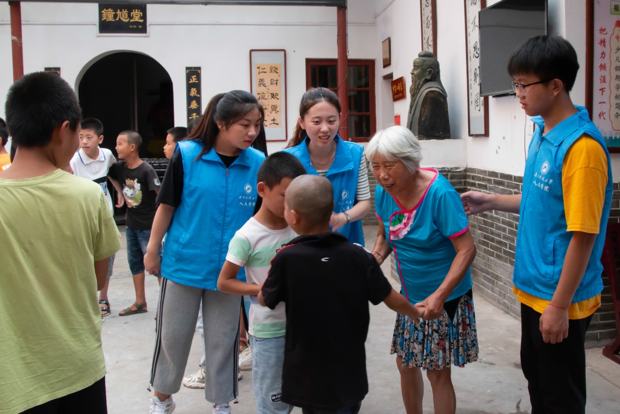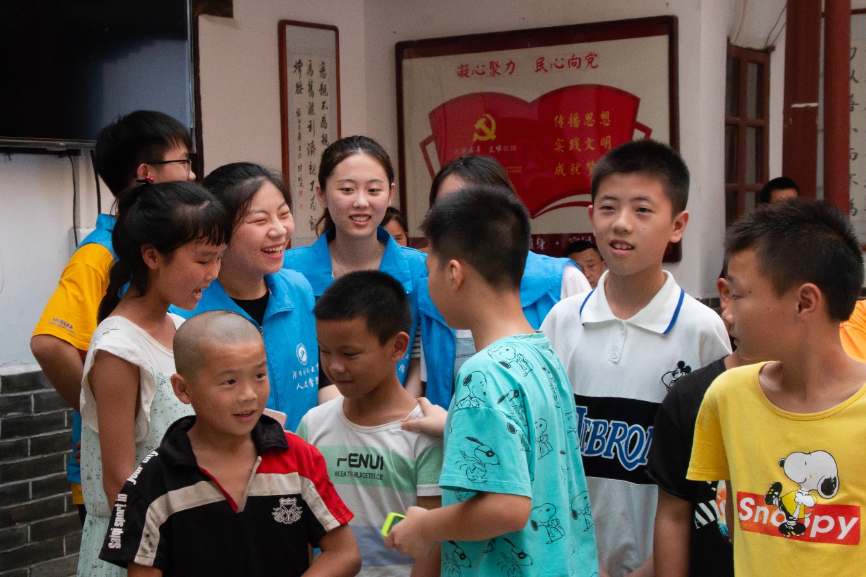▲杨莲金老师和志愿者们与孩子们积极互动