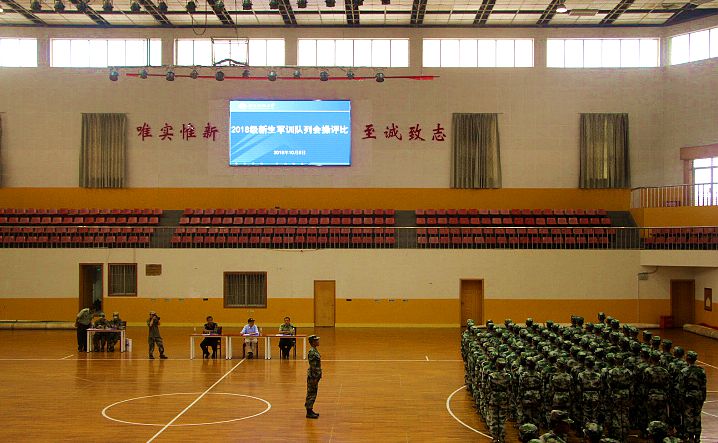 在前一学院会操完毕之后,我院方阵队在尹教的带领下,迈着整齐的步伐,庄严肃穆地走向体育馆正中央,开始队列会操评比。此次评比内容为:立正、稍息、跨立;停止间转法;蹲下、起立;敬礼、礼毕;齐步行进与立定;跑步行进与立定;正步行进与立定。方阵队全体成员认真聆听教官的指令,动作简洁有力,口号铿锵有力,各个流程都顺利完成。最后 比赛结束,学员们边喊着口号“雄鹰翱翔,我心飞扬;尖刀人文,勇创辉煌”,边有序离场。