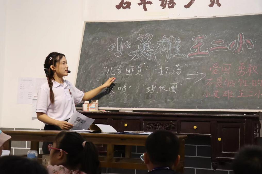 在二年级的课堂上,志愿者龙杨慧生动形象地为同学们讲述了小英雄王二小的爱国革命历程,同时通过举手回答趣味问题的环节,调动学生们的课堂积极性。在龙杨慧的不断鼓励下,二年级小朋友们高举着小手积极回答问题,稚嫩的童音在教室响起,“是王二小用生命保护了村子里许多人,他是我们要学习的英雄。”学生郭李睿大声说道。