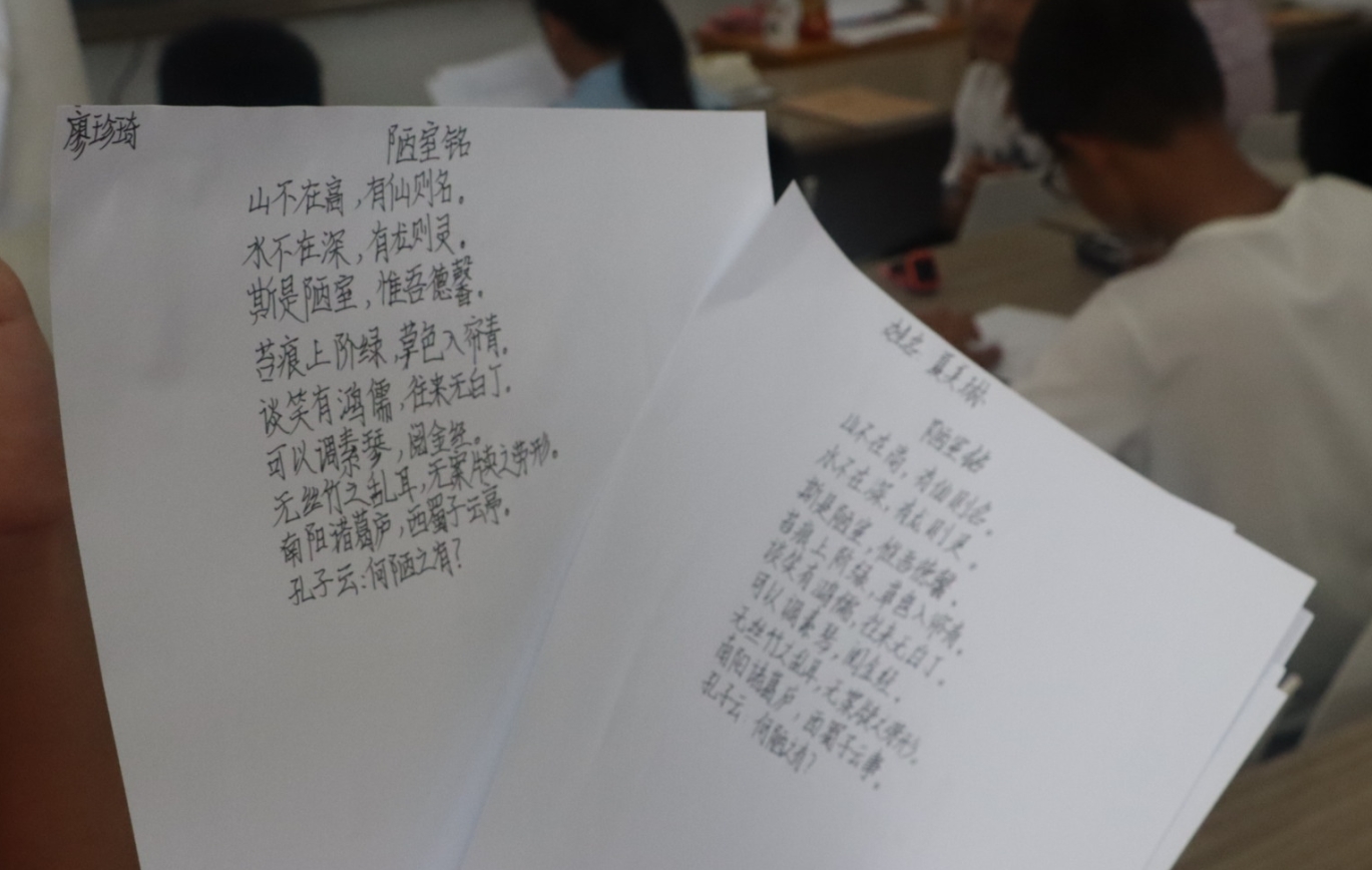 心中有沟壑,笔墨做山河。写字比赛”现场,各个教室响起沙沙的写字声,孩子们握着笔,屏息静气,诚心正意,一笔一划认真书写,神态自若地完成自己的作品。墨迹在纸上慢慢化开,丝丝缕缕渗进纸张,一幅幅作品便完成了。夏昭炎教授、杨莲金老师、夏春初老师以及志愿者们分别穿梭于各个正在比赛的教室,查看同学们的比赛情况。