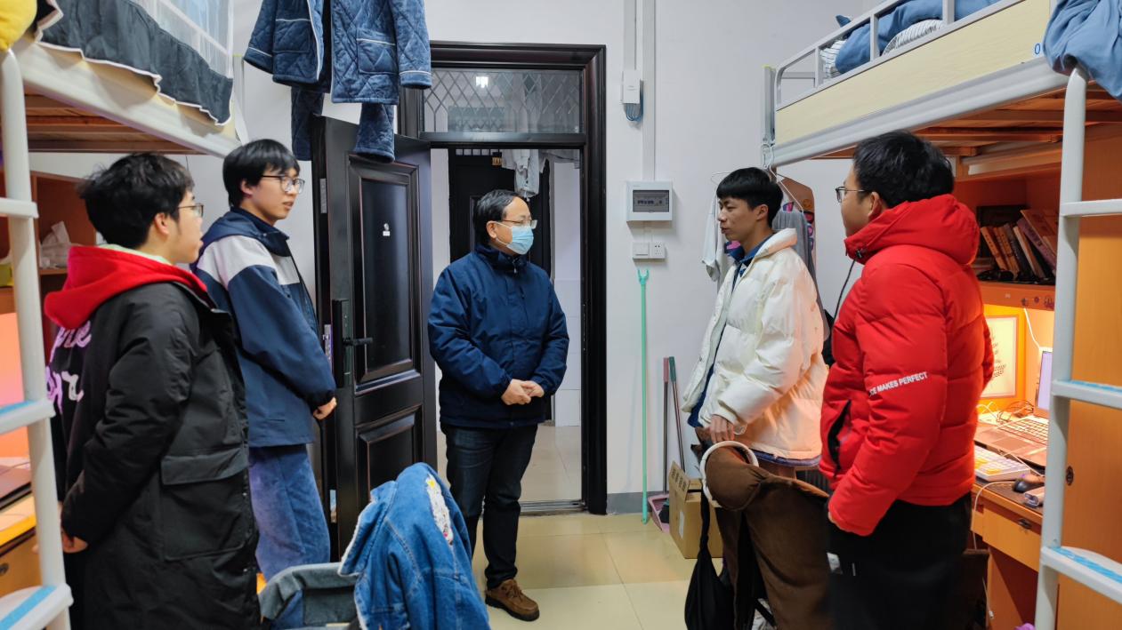 走访过程中,曾志东对学生宿舍的卫生状况表示肯定,称赞寝室干净整洁,他强调,学校和学院始终把学生的学习生活需求放在第一位,第一时间回应学生诉求,尽最大努力满足学生学习生活需要,为广大学子营造安全、舒适、温馨、便利的校园生活环境。同时,他希望同学们能以更加良好的精神状态投入到学习中,以充实饱满的精神风貌过好在校园内的每一天。交谈中,同学们向老师们分享自己开学考试准备情况、生活状态,表达自己对开学考试的担心,老师们细心回应,认真聆听每一位学生的需求,党委副书记罗振军耐心安抚学生们不安的心情:“保持平常心,对自己有信心,努力终会有回报,预祝同学们考出理想的成绩。”