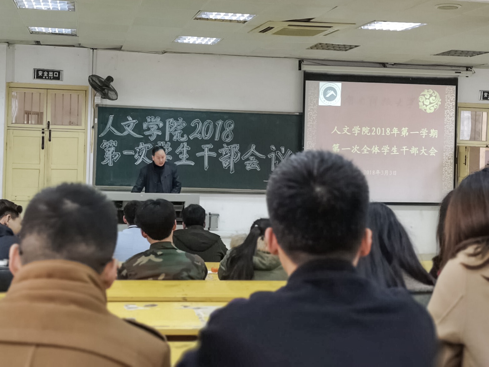 为迎接新学期的到来,推进学院学生管理工作的有序开展。3月3日下午,我院于十教附一102教室召开了2018年度第一学期第一次全体学生干部会议。我院党委副书记邓辉、学工办主任马忠石、学工办老师曾思妍等参加并主持了此次会议,我院团委学生会及各班级全体学生干部到场聆听并集中收看2018年度学校共青团网络视频。