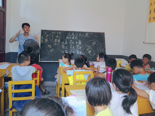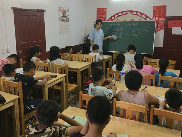 “They love their …”志愿者张榆东顿了顿,“这里应该填family吗?”五年级的教室闷热却没有躁动,同学们目不转睛地注视着张老师,每到重要的内容便纷纷记下。“如果‘they’是一家人,那应该填‘family’;但如果不是一家人,是不是就应该填‘families’呢……”在讲解名词复数变换规律的同时,张榆东还不忘设想语境中可能出现的各种情况。教英语不仅仅是灌输简单的单词与语法,更是传授另一种语言逻辑。“孩子们很聪明也很好学,作为老师我不能出现错误,否则会给他们的学习造成困扰。”身型高大声线沉稳的他,在孩子们面前却更多地展现出了细腻严谨的一面。
