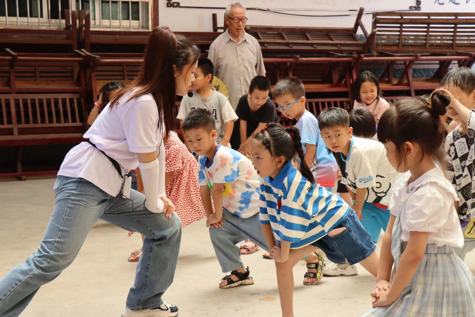 ▲志愿者教学生热身
