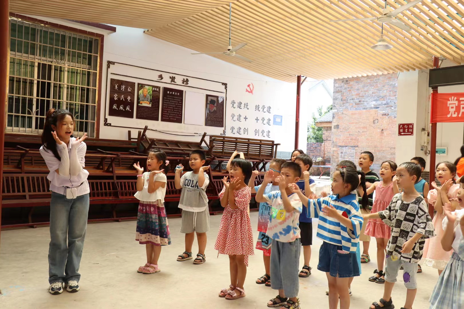 舞动青春漾童心,高歌梦想展翅飞。风雨棚里凉风习习,送来一片欢笑声。“左手左手比个yeah,右手左手开出花。”志愿者龙杨慧教一年级小朋友跳起了舞蹈,将音乐中青春力量带进课堂,舞动青春,让学生们在舞蹈中挥洒童心。随后,志愿者罗潇潇教孩子们唱《送别》和《歌唱祖国》,只见她一面清唱歌谣,一面示意学生们跟着她的旋律放声歌唱。