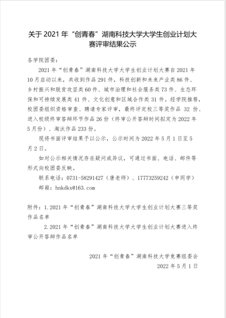 关于2021年“创青春”米兰平台大学生创业计划大赛评审结果公示