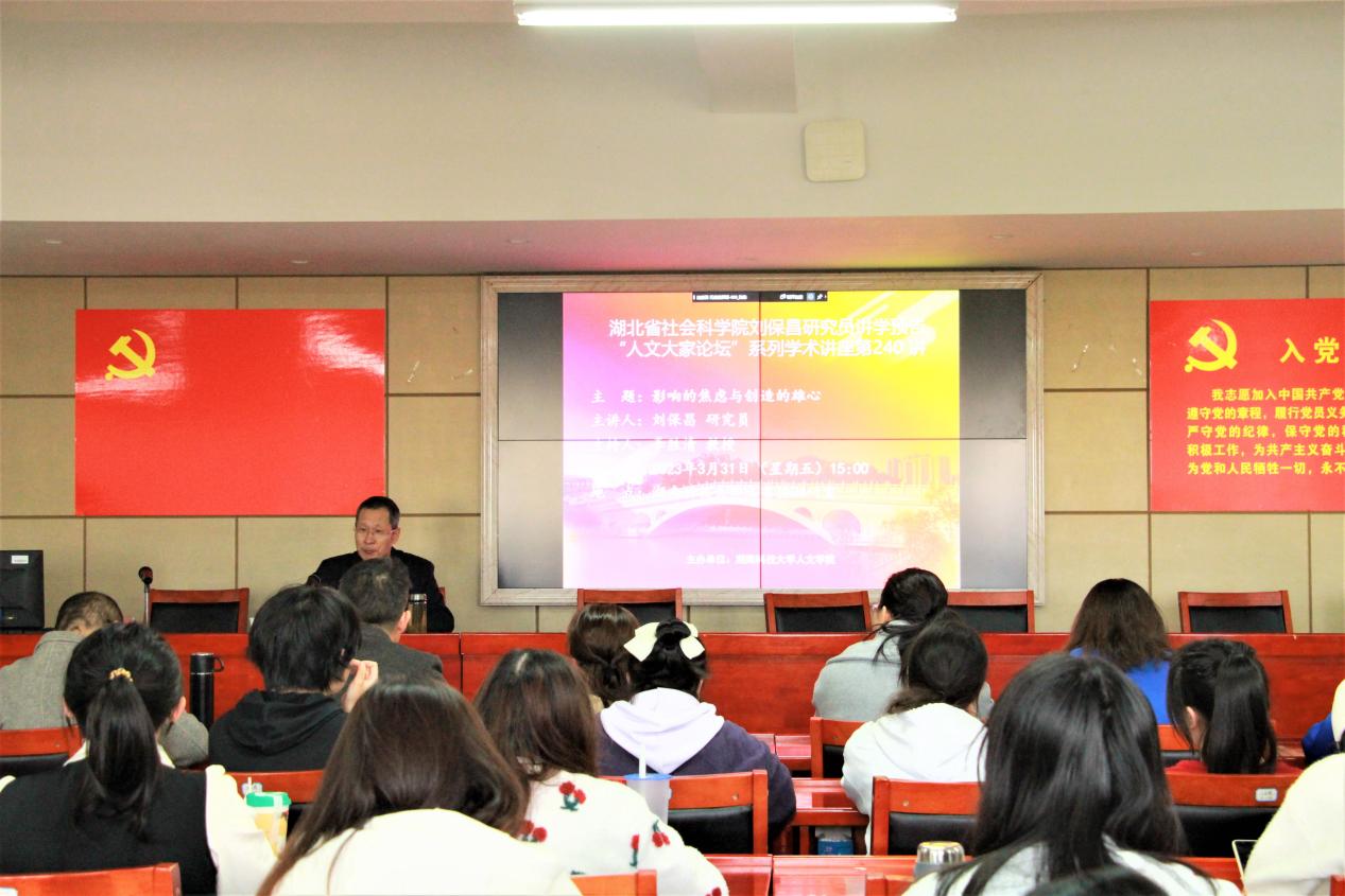3月31日下午,由米兰平台米兰平台主办的“人文大家论坛”第240讲于立言楼B4-1室举行。湖北省社会科学院二级研究员刘保昌先生应邀为我院师生做题为“影响的焦虑与创造的雄心”的学术讲座。本次讲座由李胜清教授主持,刘郁琪、胡志明、梁小娟、邓桂英等老师以及汉语言文学专业研究生和本科生到场聆听。