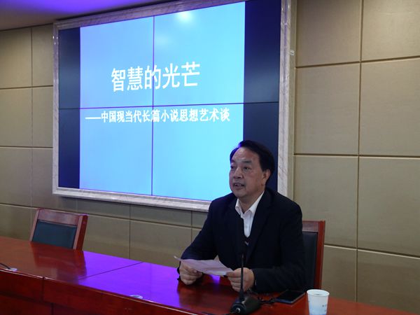 11月12日晚,我院诚邀四川大学文学与新闻学院陈思广教授于立言楼B4-1举行以“中国现当代长篇小说思想艺术”为主题的讲座。讲座由我院彭在钦教授主持,吴投文、张晚林、刘郁琪、胡志明等老师以及16级文学专业全体同学到场聆听。