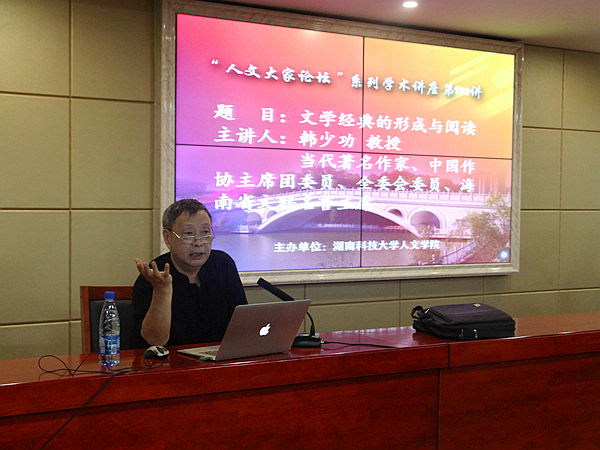 9月18日下午15点,当代著名作家韩少功教授应邀于立言楼B4-1举办“文学经典的形成与阅读”主题学术讲座。本次讲座由彭在钦教授主持,潘年英、吴投文、刘昕华、丁志丛等老师及汉语言文学专业部分学生到场聆听。